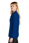 • Tailored for a feminine fit with a self-fabric collar, open neckline, longer length, high-low hem and side vents